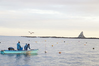えぼし岩に見守られながら育つ「えぼしわかめ」