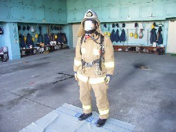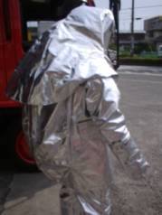 火災等の災害現場で、熱や落下物から身を守るための、特殊な服とヘルメットです。