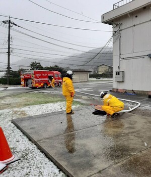 本日は7時から輪島市町野町管内の防火水槽の水入れ作業を行っています。少なくなった防火水槽内の水を水槽車から補給し、今後の災害に備えるための重要な仕事です。
