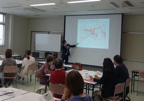 前半は、防災対策課職員による講話にて「防災」について学びました。後半は、茅ヶ崎市国際交流協会会員の井上恵さんによるワークショップで、グループごとに災害時の避難所で外国の人との間に起こりうる事例から必要な備えや心掛けについて話し合いました。