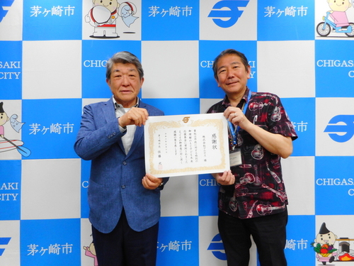株式会社マルヤス様から、子ども未来応援基金に10万円とあわせ、防災用ブルーシート50枚の寄附をいただき、感謝の意を込めて、市長より感謝状の贈呈を行いました。
