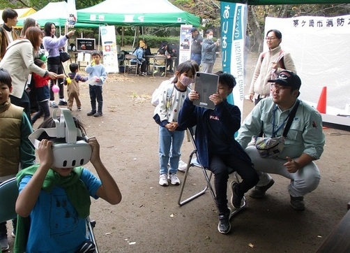 消防防災フェスティバルでは、水消火器体験やキッズレンジャー体験、防災 VR・AR 体験や起震車による地震体験などの体験ブース、消防車両や防災関係機関車両などの展示ブースに多くの方々が来場し、消防・防災について興味をもって参加していただきました。