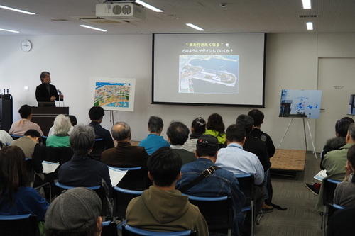 「環境デザイン~地域から発信するものとは~」と題し、伊藤隆治先生(和光大学教授・環境アートディレクター)にお話しいただきました。伊藤先生は、これまで、箱根彫刻の森の美術館の「夜のアートファンタジー」や、直島アートプロジェクトの「直島の月」の作品を手掛けた他、アクアマリンふくしまに世界最大のタッチプールを造るなど、芸術と施設と地域を結び付けることで、その魅力を発信してきました。また、「大漁旗展」や樹脂で作った「アート・カツオ展」を行ったり、干物の模型をペイントし、額を付けることで、水族館を美術館に変身させる展示の経験もあります。