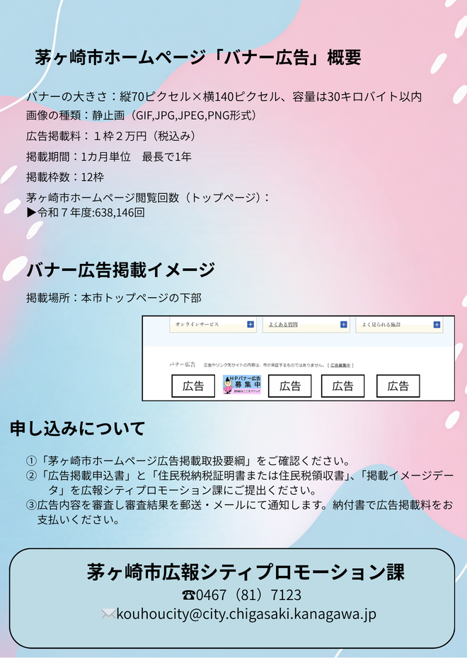 - 掲載日の10日前までに掲載料を納付、バナー原稿データを提出していただきます。