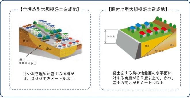 盛土造成地には、谷や沢を埋めた「谷埋め型盛土」と傾斜地盤上に盛土した「腹付け型盛土」があり、そのうち次のいずれかの要件を満たすものを「大規模盛土造成地」としています。