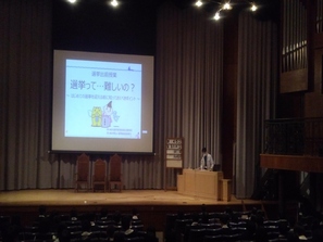講義:初めての選挙を迎える前に知っておくべき7つのポイントとして、大きな財布の使い道や投票の不思議などの動画も交えて実施