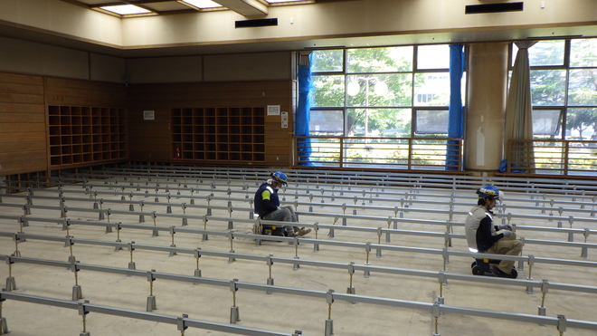 床組みが設置され、車輪付きの作業用の椅子を使って移動しながら、柔道場に向かって床束に接続しています。