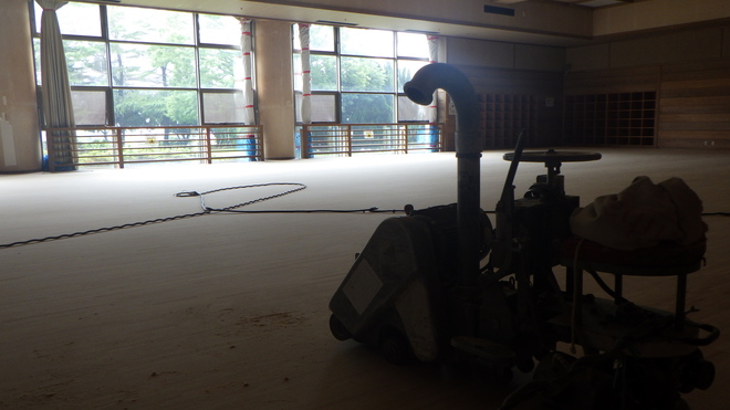 新たな床材が張られ、搭乗式の機械で床材が研磨されました。