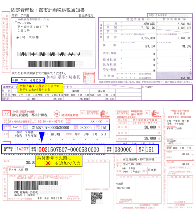 - ペイジーで納付した場合、領収証書が発行されません。領収証書が必要な場合は、金融機関窓口、コンビニエンスストア、茅ヶ崎市役所、小出支所及び出張所にて納付してください。